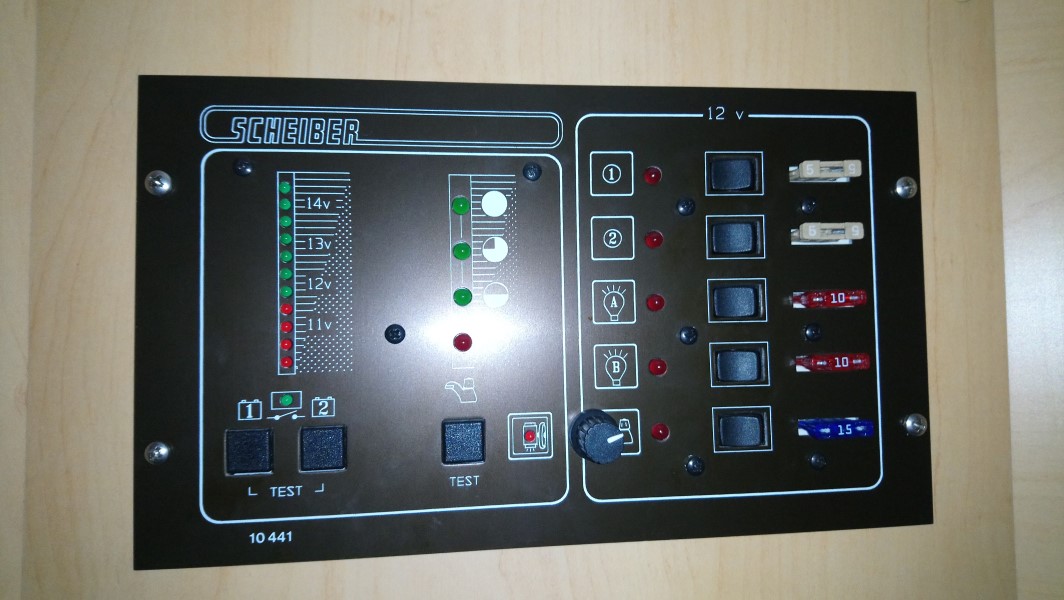 Côté technique, il y a 3 parties : l'électricité, l'eau et le gaz. Pour l'électricité, le stockage se fait dans une batterie séparée de celle du véhicule, qui se recharge de 3 façons : quand on roule avec l'alternateur une fois la batterie du véhicule assez chargée, avec la panneau solaire qui se trouve sur le toit et enfin quand on est connecté au 220 V grâce à la prise située à l'extérieur. Nous avions à l'origine un frigo mais la consommation nous a semblé trop importante et nous avions pris l'habitude à moto de gérer les produits frais à la journée. Pour la petite bière fraîche, suivant les pays il suffit de la mettre dehors ou d'aller au pub... Un panneau de commande nous permet de voir la charge restante et de mettre en tension ou pas les lampes, la pompe à eau, … Le chauffage (TRUMA 4), même s'il fonctionne au gaz, a besoin d'un peu d'électricité pour le panneau de commande et le ventilateur qui assure la circulation de l'air. Pas d'électricité, pas de chauffage... Mais aux dernières nouvelles nous produisons plus de courant que nous n'en consommons donc pas de soucis, on verra par temps froid si ça tient. Pour l'eau il y a 3 réservoirs : un pour l'eau propre, 80 litres, qui se remplit par l'extérieur et qui sert pour le TRUMA (eau chaude), le lavabo, la douche, les WC et l'évier. Les 2 autres réservoirs font 30 litres chacun et permettent de recueillir d'un côté l'eau de l'évier, de l'autre côté tout le reste (hors WC qui ont leur cassette dédiée). Le niveau d'eau propre et le fait qu'un réservoir d'eau grise soit plein sont indiqués au niveau du panneau de commande électrique. Pour le gaz il y a 2 bouteilles de propane « Elfi » jaunes. Cela permet d'alimenter les 2 plaques de la cuisine et sert pour le TRUMA : eau chaude et chauffage. Ce sera peut-être changé un jour pour des modèles au Diesel, qui vont chercher directement dans le réservoir, ce qui permet de ne plus avoir à gérer les bouteilles de gaz.