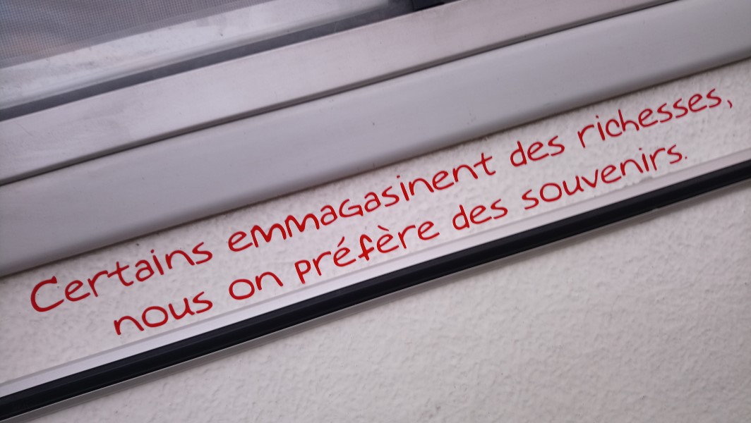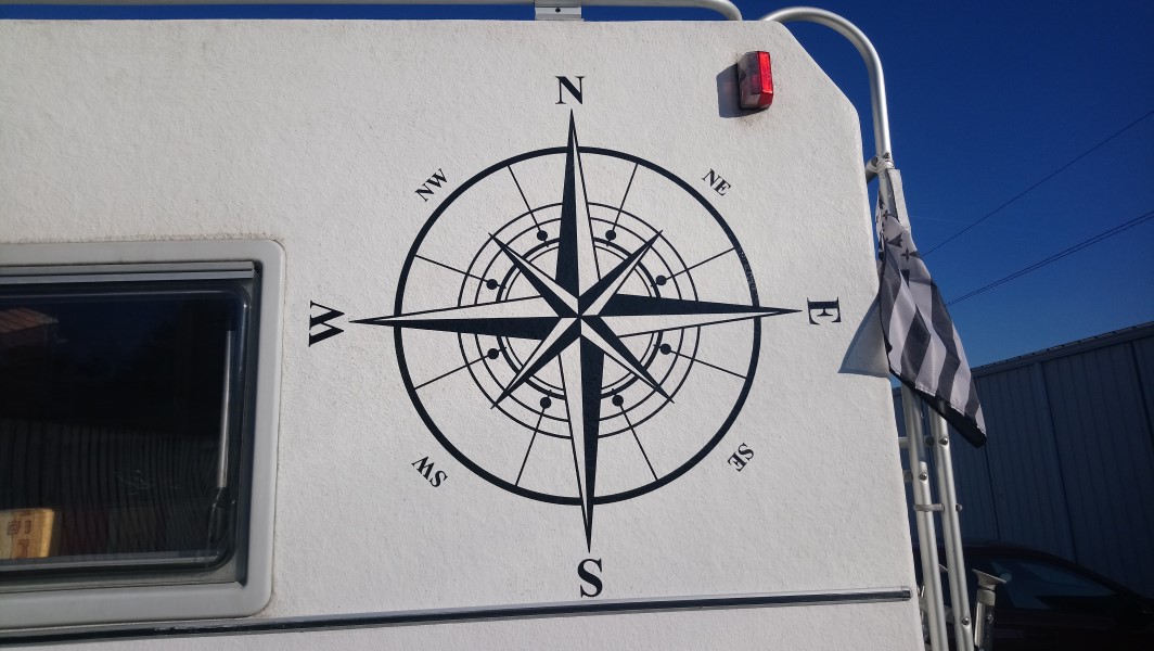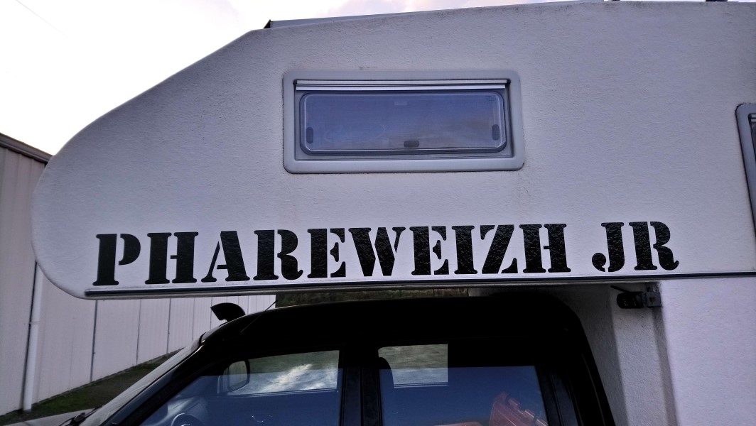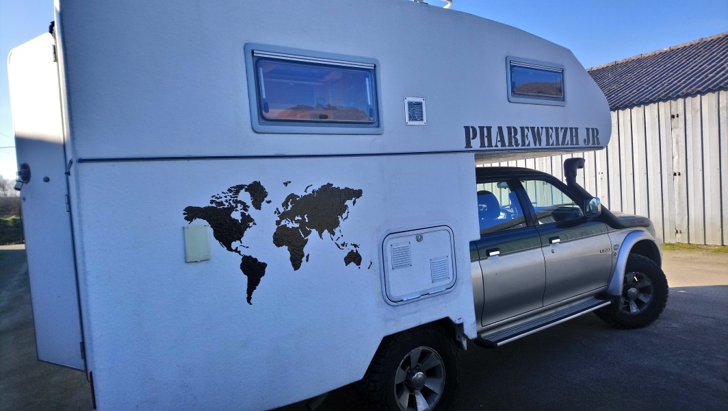 Côté préparation, il y a eu plusieurs petits chantiers. Le premier a été de choisir notre literie. Le matelas qui s'y trouvait nous a semblé lourd pour un confort relatif. Après plusieurs essais divers et variés avec le matériel dont nous disposions pour la moto, nous avons opté pour un autre choix toujours écarté à moto à cause du contact direct avec le sol : le matelas gonflable. C'est pour l'instant le meilleur choix poids / confort / isolation. On verra si ça tient dans le temps. Un autre chantier a été le nettoyage des cuves. Remplissage de tous les réservoirs avec de l'eau + produit spécifique, un peu de ballade avec secousses pour tout bien mélanger, vidange, remplissage à nouveau pour rincer, secousses, vidange... on fera pas ça tous les jours ! Nous nous sommes également attaqués au poids en retirant le frigo (qui nous semblait superflu), la porte de douche (remplacée par un rideau) et divers petits aménagements dont nous n'avions pas l'usage. Les joints ont été, comme pour le pick-up, passés à la graisse silicone. Nous avons doublé notre système de chauffage d'un chauffage électrique céramique (il faut du 220V). Enfin un jerrican a été installé à l'arrière pour stocker un peu de carburant en réserve. Une barre a aussi été ajoutée pour mieux verrouiller la cellule depuis l'intérieur (en cas d'attaque d'ours blanc...). Nous avons également voulu mettre notre petite touche personnelle donc nous avons enlevé les autocollants qui se trouvaient de chaque côté et nous avons commandé 4 marquages : 2 « PHAREWEIZH jr » (Junior), une boussole et une carte du monde. Nous avons posé tout ça ainsi petite phrase offerte par des amis qui se reconnaîtront.