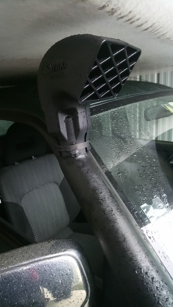 Le matériel augmente petit à petit et nous décidons de faire de la place pour mieux ranger tout ça. Nous enlevons donc la banquette arrière et la remplaçons par une caisse fixée sur les mêmes points de fixation. La caisse est en plastique, c'est de la réutilisation de ce que nous avions déjà, mais nous avons repéré pour plus tard une caisse alu aux bonnes dimensions. Nous complétons le paquetage avec une pelle, des plaques de désensablement / déneigement, une sangle Kinetic et ses 2 manilles pour être tractés et quelques outils, gants, … Une petite perte de liquide de refroidissement nous amène à changer la pompe et une petite fuite d'huile est réparée par la même occasion. L'échappement est bien oxydé, là aussi un coup de neuf s'impose... Dernier changement, sans doute pas obligatoire en hiver mais au cas où et puis nous on trouve que ça lui donne une bonne tête : le snorkel. Le but est de remonter l'arrivée d'air pour éviter de noyer le moteur pendant une traversée de rivière.