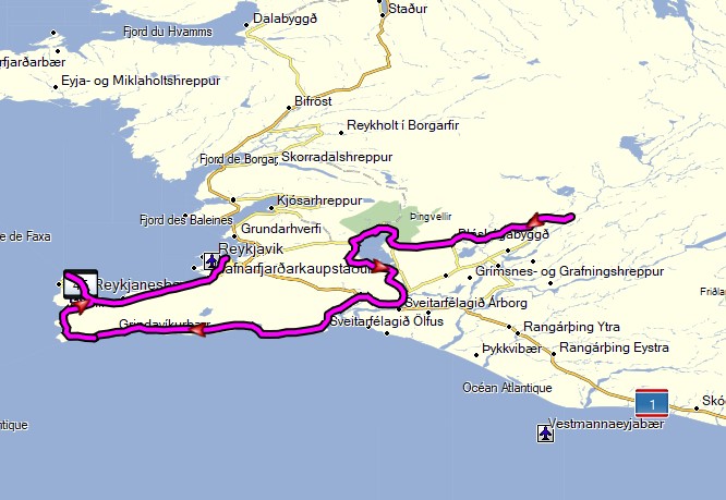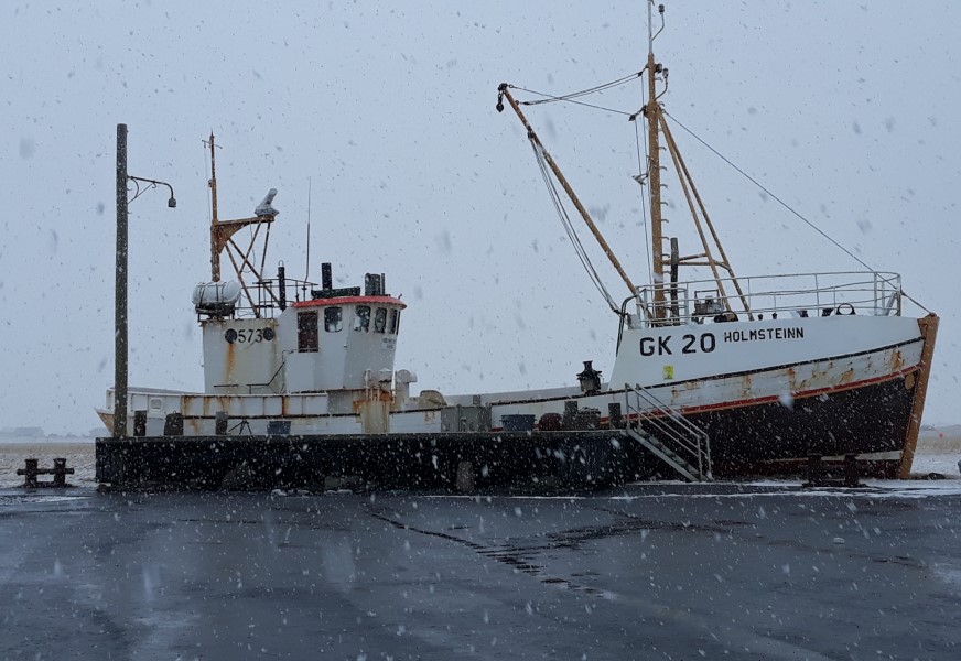 La neige recouvre rapidement le paysage et la route, donc nous optons pour un trajet plus direct vers notre destination afin de ne pas nous retrouver bloqués. Nous arrivons après cette traversée blanche à Gardur, où nous avons repéré un camping ouvert l'hiver. Nous trouvons le lieu, tout au bout, à côté du phare. Il est indiqué de s'adresser au restaurant musée tout proche, repérable par des bateaux posés à terre. On nous indique le prix (pas donné) et surtout le peu de service, en particulier l'absence de douche. Le besoin d'hygiène l'emporte, direction Reykjavik où nous trouvons notre bonheur : le camping est presque ouvert, mais l'auberge de jeunesse proche fournit tous les services. Nous nous installons pour 2 nuits afin de visiter la capitale.