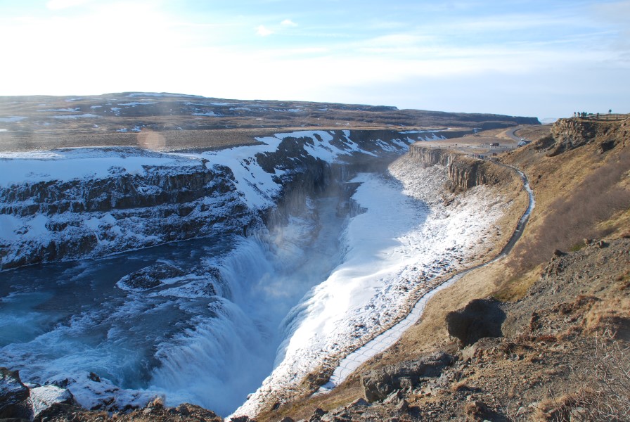 Nous prenons ensuite la route de Gullfoss, cascade (vu que ça termine par « foss » vous aviez deviné...) majestueuse et puissante, en 2 niveaux, large dans sa partie haute et qui se jette dans un canyon dans sa partie basse. Le débit est impressionnant et pourtant nous sommes en hiver.