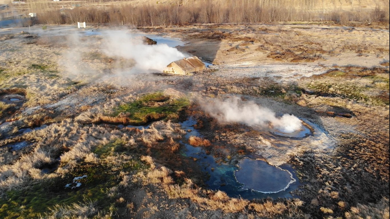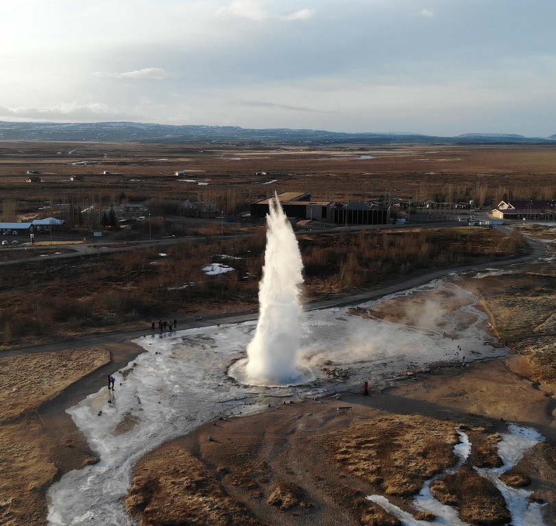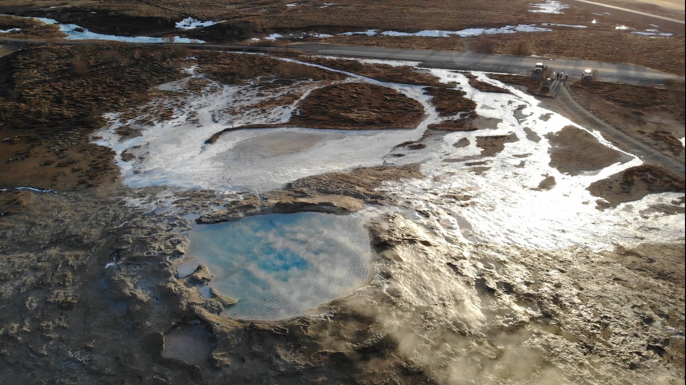 La nuit passée à Geysir sur ce qui est presque un camping (pas âme qui vive là bas de nuit, ni autours malgré les quelques commerces), nous profitons du calme matinal pour déambuler dans le champs géothermique de Geysir. 8 heure du matin, il n'y a presque personne, sauf 2 ou 3 acharnés qui sont venus encore plus tôt à la recherche de la photo parfaite, appareils sur les trépieds, filtres, déclencheurs, … Nous, on fait ce qu'on peut pour capter les sursauts, non pas de Geysir qui en fait ne se réveille que 2 ou 3 fois par jours, mais de Strokkur, son voisin, qui lui bondit toutes les 5 à 10 minutes. La force est variable et ressemble parfois à un « pfff » tout calme, et parfois à un jet fier et fort... Nous profitons également du calme pour faire voler le drone et prendre quelques clichés et vidéos sympathiques.
