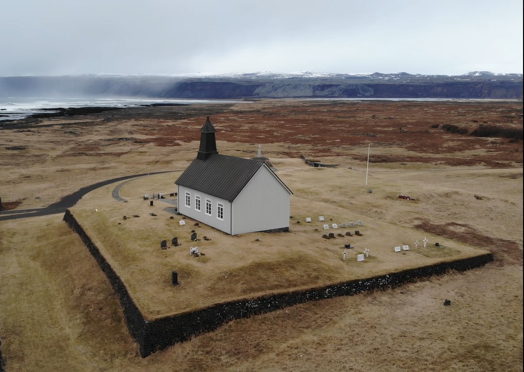 La suite de l'itinéraire doit nous amener vers la péninsule de Reykjanes (celle qui se trouve au sud ouest de l'Islande), avec plusieurs arrêts prévus avant d'en atteindre l'extrémité. Nous avons bien vérifié les conditions de route sur « road.is », idem pour la météo, rien à signaler. Surprise, la neige nous rejoint peu de temps après notre premier arrêt, à l'église « Strandarkirkja » (12ème siècle, sa belle histoire sur wikipedia...).