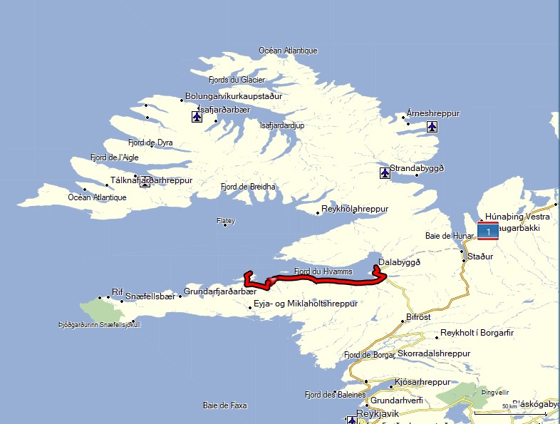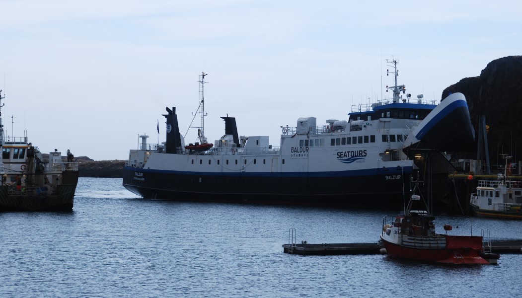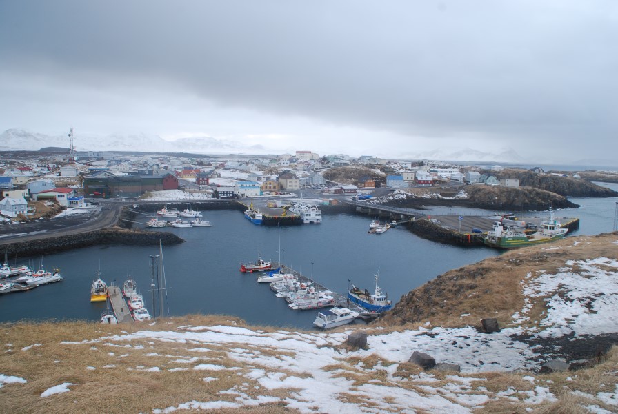 En début d'après-midi nous décidons d'aller visiter le centre de Stykkisholmur. Très jolie ville où l'ambiance y est typiquement Islandaise : maisons de couleur, petit port, neige et montagne en toile de fond. Nous apercevons le ferry qui traverse vers les fjords du nord et renonçons à le prendre, Karine, rien qu'à le voir, à des haut-le-coeur, sans doute des restes de la traversée vers l'Islande...