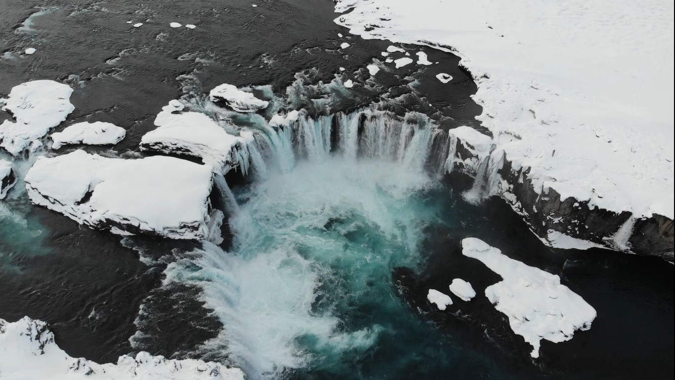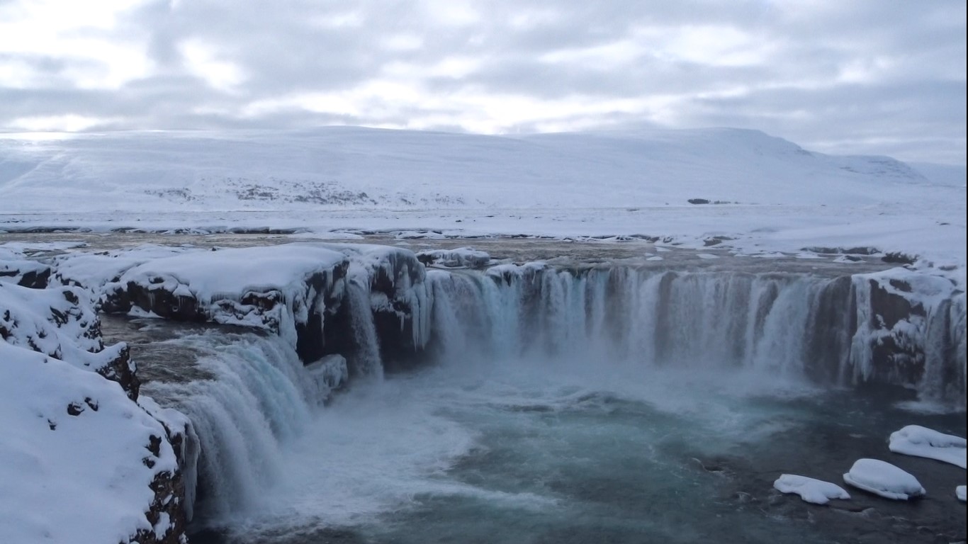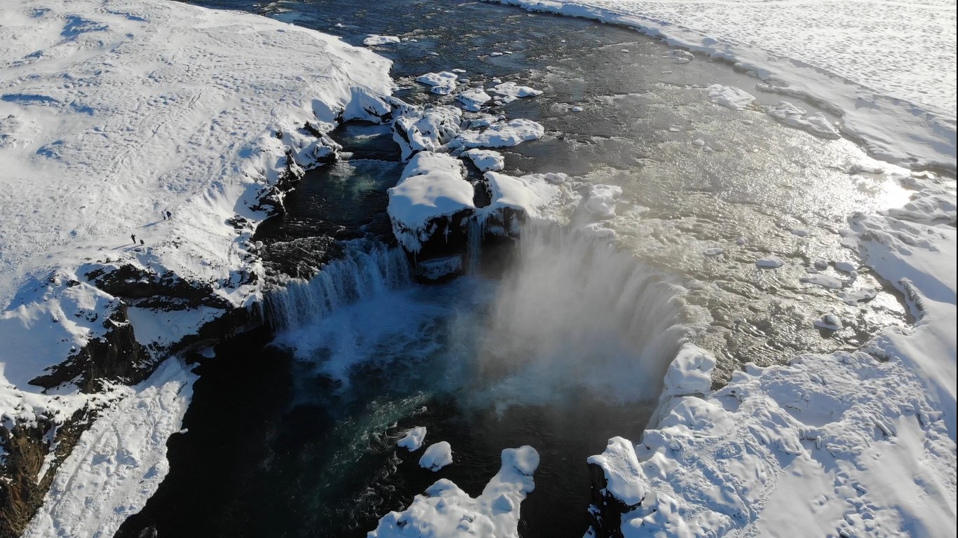 Nous prenons maintenant la route direction les cascades de Godafoss et Geitafoss. Une pure merveille dans son écrin de neige. Le temps est magnifique et les reflets du soleil nous permettent de faire de belles photos. Le drone fait un petit tour du côté droit de la cascade et du coté gauche, la totale. Nous restons 1h30 sur le site, c’est magnifique. Juste une petite parenthèse et notre coup de gueule du jour. A Godafoss nous avons eu les tripes retournées quand nous avons vu des inconscients s’approcher du bord pour un selfie ou pour « la photo ». Franchement risquer sa vie pour un cliché c’est complètement stupide. Le principal c’est ce que l’on voit avec ses yeux et avec son cœur.