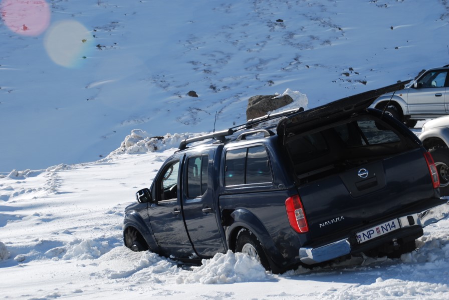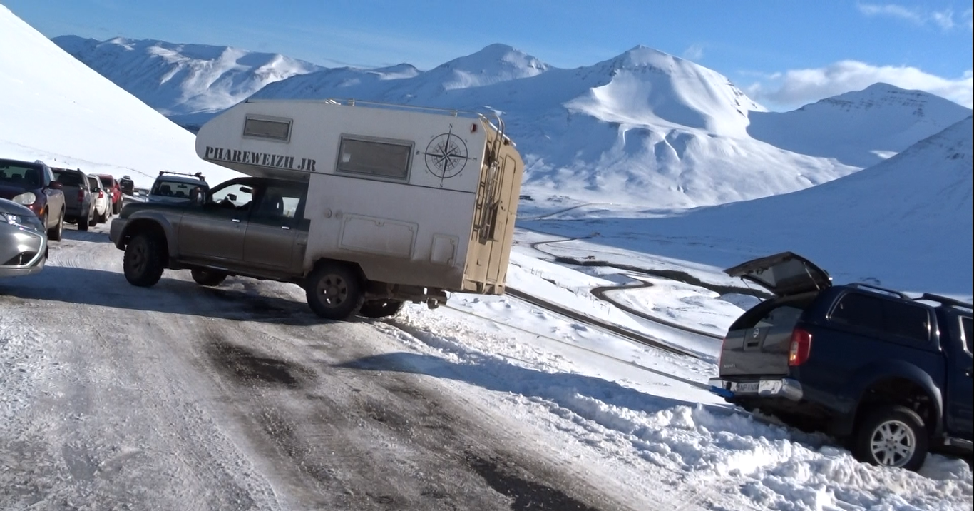 En repartant nous croisons un islandais en difficulté, il a planté son gros 4×4 sur le bas côté et pas moyen de ressortir. Nous lui proposons notre aide. Sangle kinetic sortie, Junior se met en position. Il dérape dans tous les sens car la route est gelée. Ça ne veut pas sortir. Nous essayons une autre position de manœuvre, le gars accélère et les deux roues avant de son Nissan Navarra creusent et font de grosses ornières. La corde se met en tension et junior nous fait un beau balayage sur le côté, l’embrayage commence à fumer. On arrête tout, trop périlleux. Après quelques gouttes de sueurs nous reprenons la route un peu sous le choc de cette nouvelle expérience et notre islandais part demander de l’aide à un tracteur et cela toujours avec le sourire et de bonne humeur.