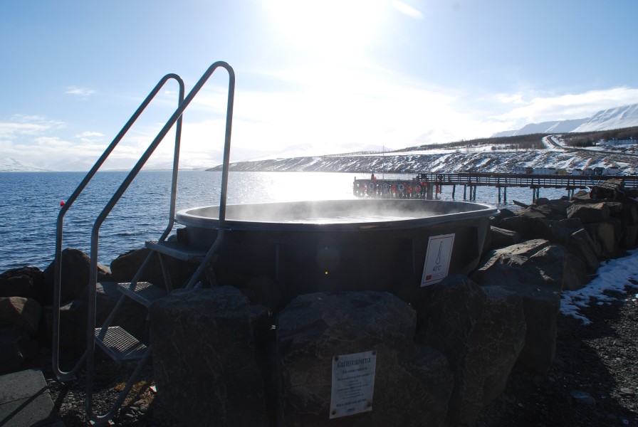 On avance un peu plus sur ce site, le long de la vieille usine désaffectée et nous apercevons un panneau qui semble indiquer quelque chose dans les fonds sous-marins. Un fois que nous avons trouvé la partie en anglais (on ne maîtrise toujours pas l’islandais…), nous comprenons qu’au fond du fjord (c’est la mer) se trouvent plusieurs cheminées formées depuis 11 000 ans par des sources chaudes à 79°C. La plus grande part du fond (à 70 mètres de profondeur) et remonte jusqu’à -16 mètres soit près de 55 mètres de cheminée ! On aperçoit en face du panneau un centre de plongée ou l ‘instructeur PADI est en train de mettre sa combi étanche. Nous amorçons la discussion et celui-ci nous propose de monter voir le petit musée du centre. Il nous explique les différents sites sur place et la formation des cheminées géothermiques de Strytan, unique au monde, qui se trouve tout près de nous. Les minéraux remontent dans la cheminée et au contact de l’eau continuent à faire croître la structure. Il nous montre de nombreuses photos de la vie très riche qui profite de cet oasis sous-marin. Il est ensuite temps pour lui de partir, son matériel de photo est prêt, il rejoint on zodiac et nous laisse devant le centre de plongée où se trouve un jacuzzi géothermique, eau à 40°C, où les plongeurs peuvent venir se détendre ou se réchauffer.
