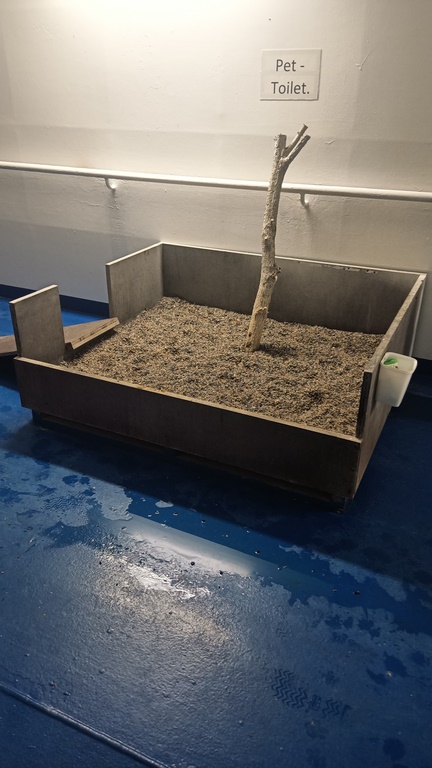 Hop un coup d’ascenseur jusqu’au pont 7 et nous voilà dans notre « pet cabine ». Dépose des sacs a dos et petit tour sur le pont réservé aux chiens. Là trône un grand bac à litière où un semblant d’arbre sert aux levés de pattes.