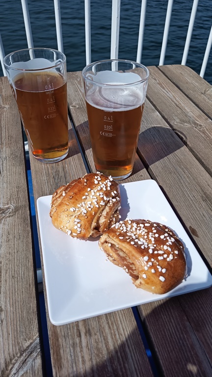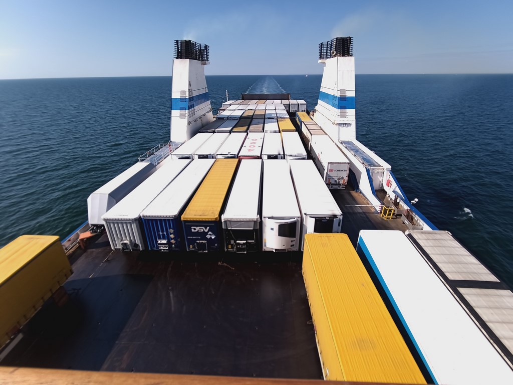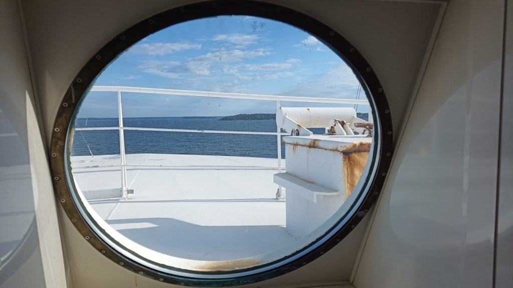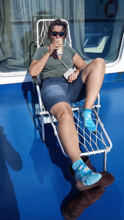 On descend du fourgon et Preik commence à nous faire la danse du ferry qui consiste à aboyer en sautant sur place, ce qui décroche des petits sourires du personnel navigant.