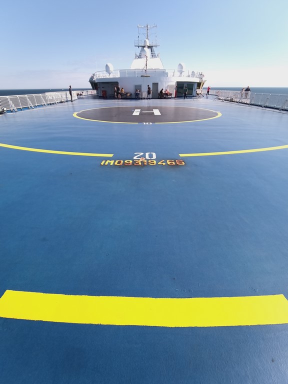 On suit la voiture gyro jusqu’au pont 5, là où sont parqués les véhicules ayant un plus gros gabarit (caravanes, campings car, bus etc..) ce sont ceux qui entrent en dernier et les motos en premier.