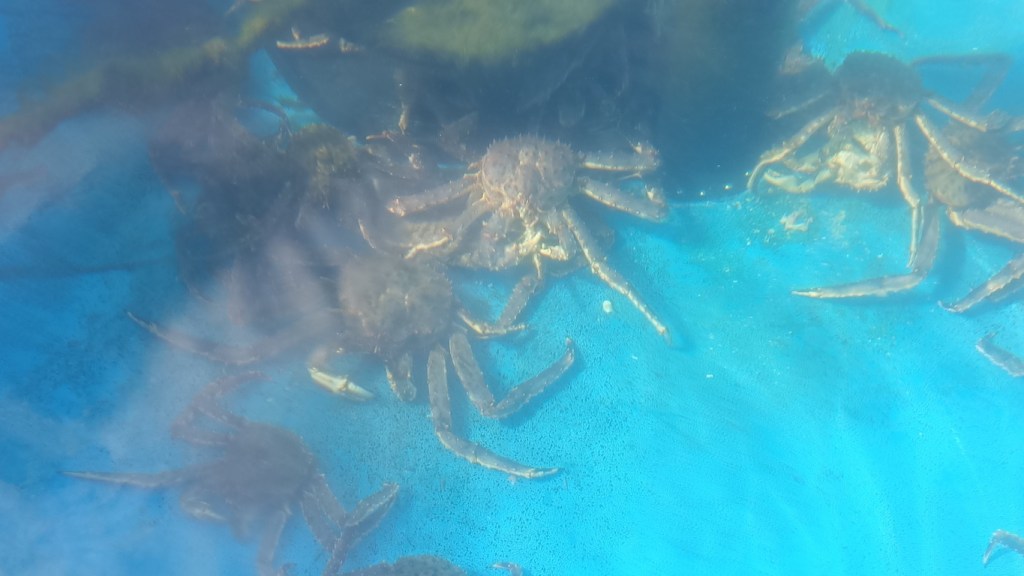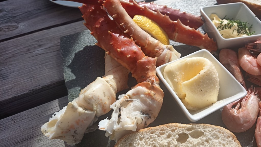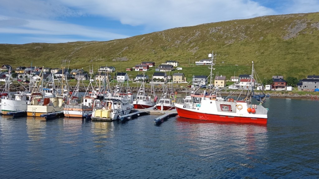 Skarsvag est, d’autant plus avec le soleil du jour, un charmant petit port, actif, où nous prenons le temps de nous promener avant de déguster un café/gaufre au magasin de déco de Noël, puis un crabe royal au restaurant accolé à l’exploitation au bout du port. Le crabe est cher comme partout… c’est une expérience, mais nous restons avec un faible pour nos tourteaux bretons…