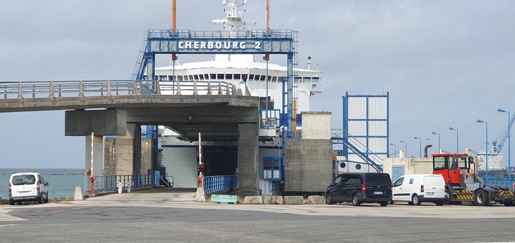 Nous avons donc fait la route Erquy Cherbourg, en apercevant le Mont St Michel au passage et avec une petite pause café sur une aire, mais bizarrement sans nous sentir encore réellement en voyage, peut-être parce que nous connaissons très bien ce bout de route. Comme dit un voyageur dont nous suivons les aventures, « la découverte du monde n’attend pas », mais là ce n’était pas encore de la découverte, passons à la suite… Embarquement sans soucis à Cherbourg dans le Barfleur de la Britany Ferries. Un pré checkin du chien pendant que nous faisons la queue accélère le passage à la guérite avec seulement une lecture de la puce pour vérifier qu’il s’agit bien de Preik. (Il semble même possible d’après la dame du guichet de faire ce pré checkin en ligne mais nous ne le savions pas).