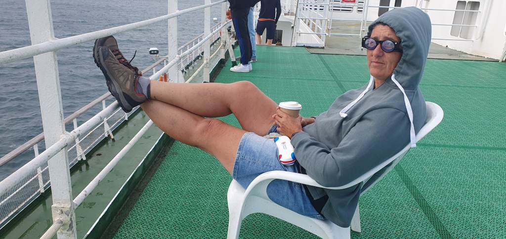 L’accès au bateau est rapide, nous laissons notre compagnon à 4 pattes dans le fourgon et nous rejoignons notre cabine pour quelques heures de traversée avec une mer pas tout à fait lisse…
