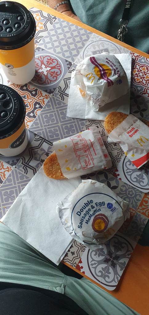 Plusieurs petites pauses pour faire bouger Preik qui est comme d’habitude adorable en voyage ! Petit repas McDo le matin (si si le petit dej est très bien…), des scones un peu plus tard (miam) et un casse-croute dans l’après-midi avec nos réserves, on attendra le pub du soir pour du chaud…
