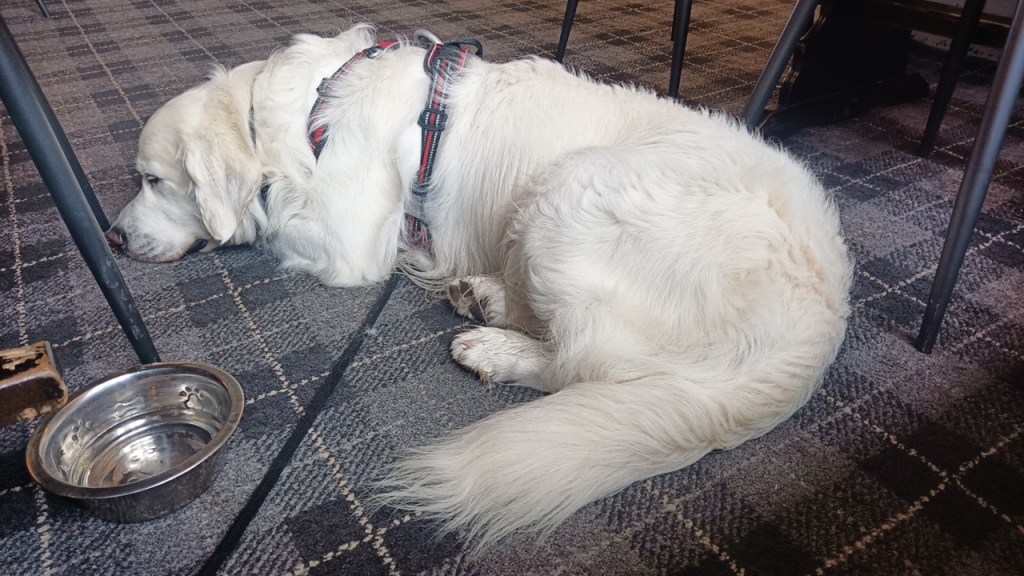 Nous sortons de la 4 voies et commençons à expérimenter les petites routes, qui vont encore largement se réduire en continuant vers le nord… Nous arrivons dans un charmant petit pub repéré par Karine, qui accepte les chiens et le fait de passer la nuit avec notre van sur leur parking. « Ils sont vraiment très accueillants, tout le monde me dit bonjour et vient me caresser » dit Preik ! Hé oui, ce golden retriever blanc fait l’unanimité auprès des serveuses et des clients… il reçoit à boire, des gâteaux, … certains viennent le saluer sans même un mot pour nous 🙂