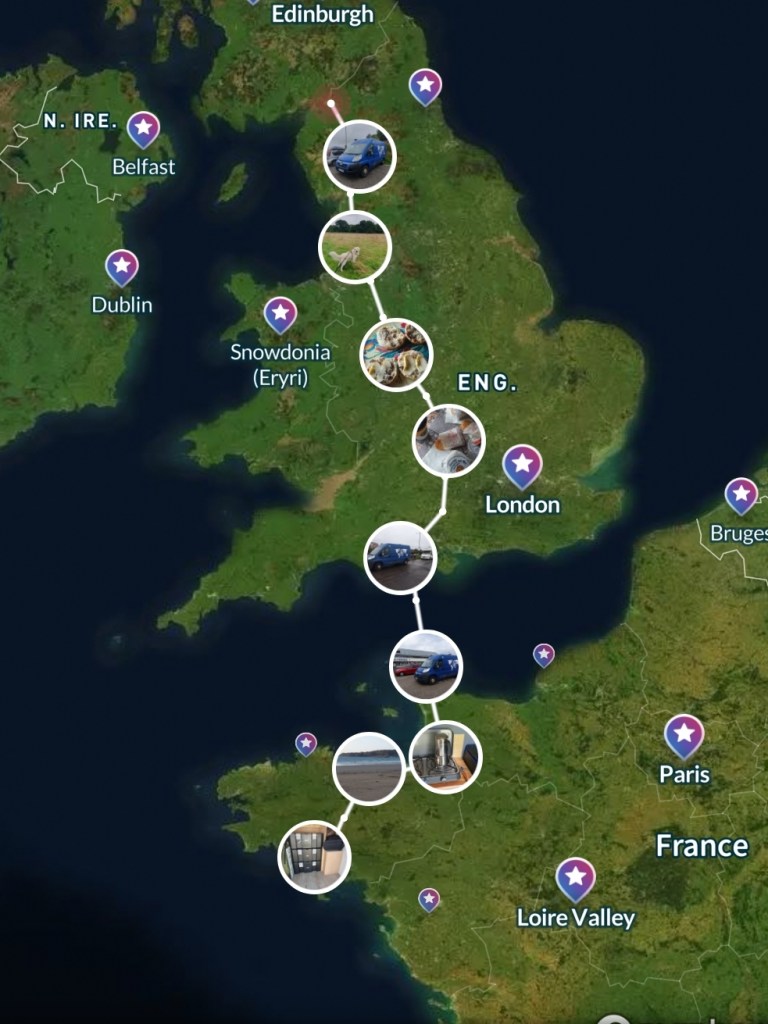 Nous pensions initialement partir vers la Roumanie et la Bulgarie, mais la chaleur annoncée nous a fait reculer, nous irons découvrir ces pays en dehors de l’été… quand nous avons envisagé de retourner en Ecosse, un soir en regardant des vidéos de voyages, il a fallu trouver comment traverser. Nous avions eu l’idée après notre premier voyage en Ecosse de le faire via l’Irlande (Roscoff/Dublin, un peu de route puis Belfast/Ecosse), mais le prix en last minute et le fait de mettre Preik en chenil nous ont fait reculer. Il fallait donc rejoindre l’Angleterre pour tout remonter afin de passer en Ecosse. Sur les multiples possibilités (bateau ou tunnel) et en tenant compte des prix, du calendrier de traversées et des conditions de trajet pour notre boule de poils, nous avons choisi de partir de cherbourg (que nous connaissons bien, départ d’un périple passé en Irlande avec découverte la veille au soir des dates de péremption dépassées pour les papiers de Stéphane…) vers Poole. Trajet court, pas de cabine avec animaux disponible mais possibilité de le laisser dans le véhicule en lui rendant une petite visite à la moitié de la traversée, nickel.