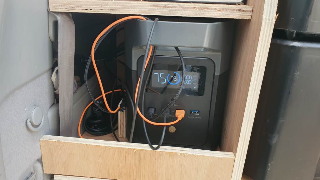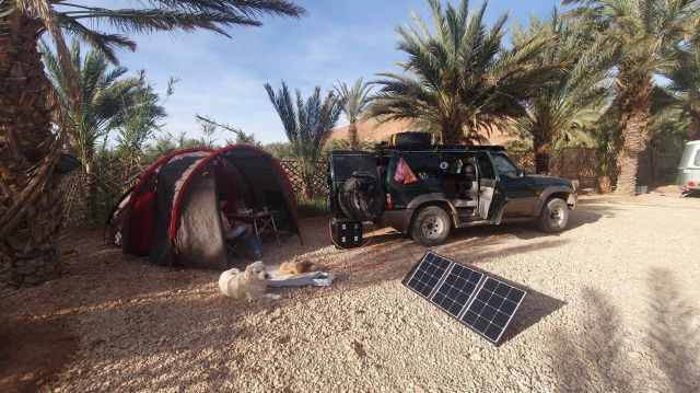 Le système électrique mis en place rapidement avant de partir s’est basé sur une Ecoflow delta mini reconditionnée. Pour la charger elle était branchée à une prise allume-cigare qui peut donner 100w, mais parfois la batterie démarre une charge plus faible pour une raison que nous n’avons pas compris… Il fallait du coup passer par le logiciel sur le mobile pour modifier le réglage de puissance de charge (6A puis retour à 8A) afin de charger à fond. Un autre système sera à installer (à base de convertisseur 12 24 v pour se faire passer pour un panneau solaire) pour optimiser la charge et permettre un meilleur rendement sur moins d’heures de roulage. À l’arrêt nous avions aussi un panneau solaire souple de 100w qui permet de profiter du bel ensoleillement (quand il n’y a pas de tempête de sable…).