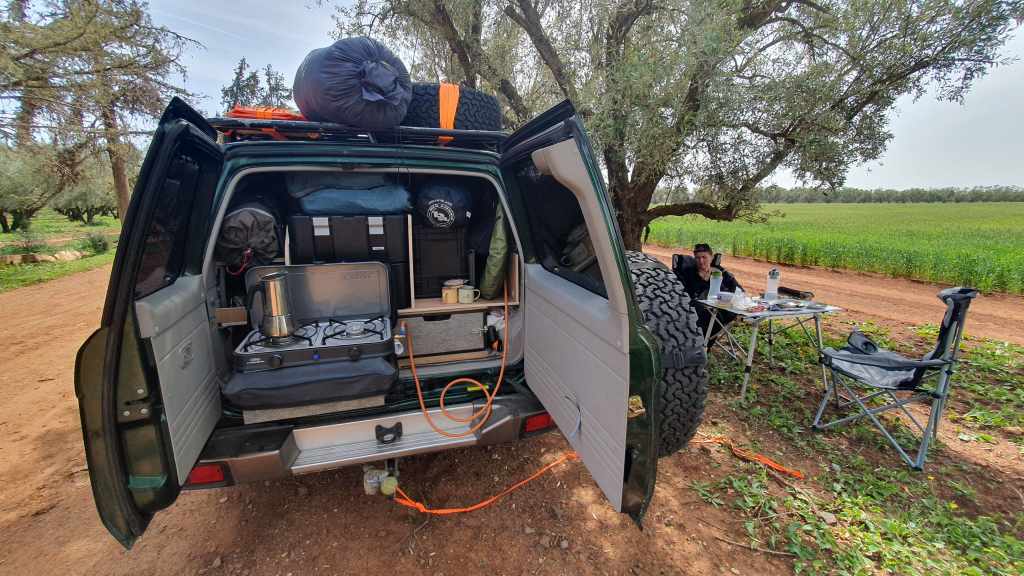 L’aménagement a très bien fait le travail… Pas de vibrations, une bonne résistance aux terrains accidentés, tout à portée de main pour monter le campement, pour préparer à manger, … Largement assez de place pour tout ce que nous voulions emporter, même si dans le futur on va réfléchir à une tente de toit (avec gestion de notre boule de poil) qui va libérer de la place dans le coffre et simplifier l’installation du bivouac.
