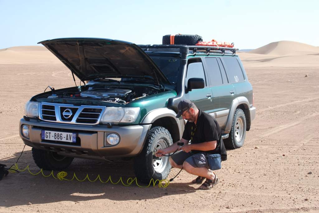 Bien sûr pour les différents terrains il aura fallu jouer avec la pression des pneus (BF Goodrich AT KO 2) : 3 bars pour la grande route, 2,5 bars sur les petites routes, 1.8 à 2 pour les chemins solides, 1,2 à 1,5 pour le sable. Et avec ça, on ne force pas… Le compresseur T-Max fait le boulot et ça s’est avéré rapide vu son débit.