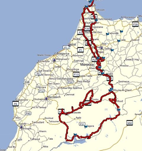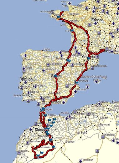 Voilà déjà un aperçu de l’itinéraire… Descente et remontée qui seront modifiées quand on y retournera (voir en bas les projets), comme prévu descente du Maroc par l’est et grande boucle au sud (plus de piste qu’on ne pensait, on y est tellement bien) et remontée par l’est qui n’était pas prévue mais on a adapté à cause de la météo qui amenait des pluies diluviennes à l’ouest, et on n’a pas été déçus en approchant de Tanger…