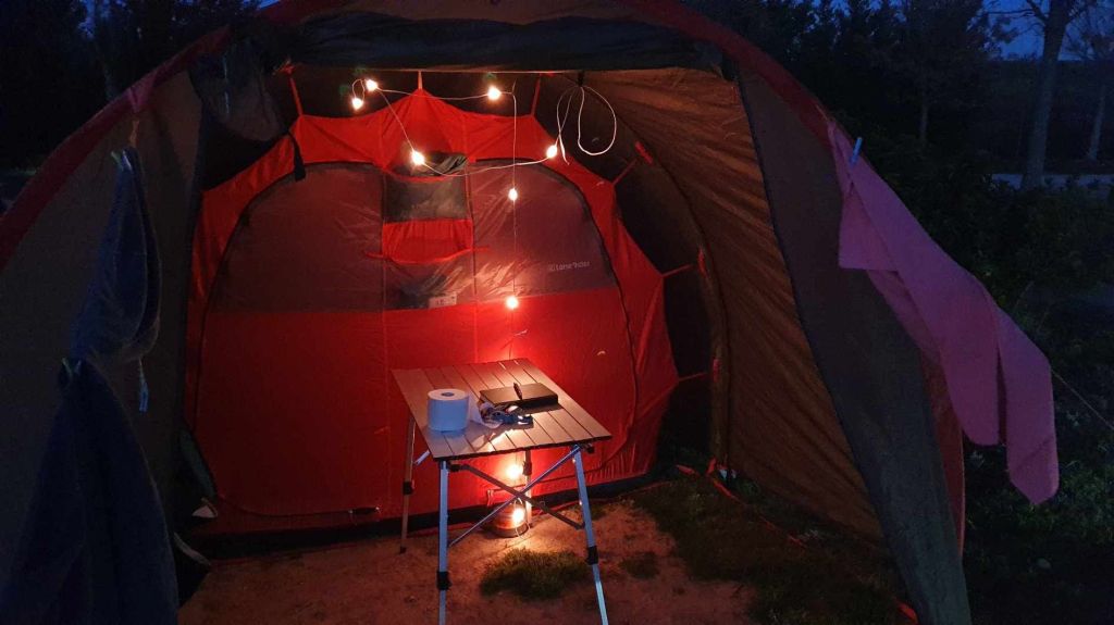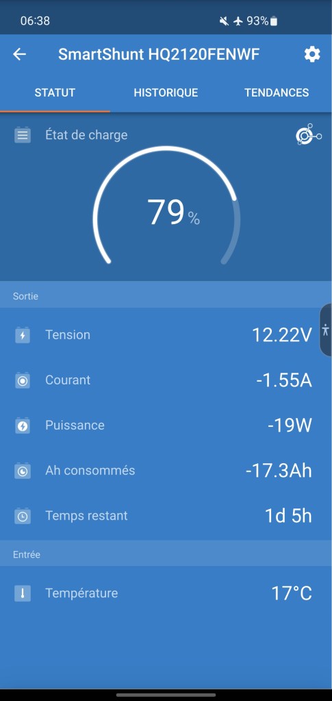 Le système électrique mis en place rapidement avant de partir s’est basé sur une Ecoflow delta mini reconditionnée. Pour la charger elle était branchée à une prise allume-cigare qui peut donner 100w, mais parfois la batterie démarre une charge plus faible pour une raison que nous n’avons pas compris… Il fallait du coup passer par le logiciel sur le mobile pour modifier le réglage de puissance de charge (6A puis retour à 8A) afin de charger à fond. Un autre système sera à installer (à base de convertisseur 12 24 v pour se faire passer pour un panneau solaire) pour optimiser la charge et permettre un meilleur rendement sur moins d’heures de roulage. À l’arrêt nous avions aussi un panneau solaire souple de 100w qui permet de profiter du bel ensoleillement (quand il n’y a pas de tempête de sable…).