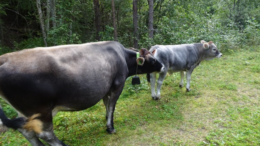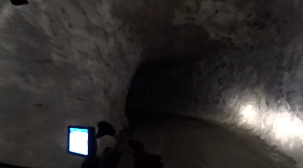 Nous repartons en passant un second barrage puis la route part dans les hauteurs… toujours pas très large, toujours en version gravel. Nous passons un chalet qui indique « airbnb », pas d’eau courant (il y a un lac), pas d’élec, 108 euros la nuit, mais quel environnement… Nous sommes en haut, il va falloir redescendre… là aussi une trèèèès belle route, digne de recevoir les roues cramponnées de belles GSA, qu’elles soient rouges ou pas (les autres, Indian par exemple, sont les bienvenues aussi, si elles osent…). Ça descend… ils ont renoncé à donner le pourcentage et ils ont sans doute raison… virolos, virolos, virolos… superbe… petite suée de temps en temps mais superbe… tiens, le GPS indique un drôle de lacet à venir, il y a une boucle avant le tronçon suivant… c’est un fait un tunnel… ou plutôt une caverne, taillée dans la roche, le sol en terre, pas éclairé… on a l’impression de s’enfoncer dans le centre de la terre… ça descend, ça touuuuurne… et hop on ressort… pour les lacets suivants… ça continue… frein moteur, au maximum pour ne pas faire chauffer les freins… ça tourne, ça retourne… et nous arrivons (enfin ?) en bas, près d’un lac que nous allons longer un moment après avoir fait une pause café petit dej près d’une belle cascade. Un troupeau de vaches en liberté sort de la forêt pour nous bloquer un moment le passage.