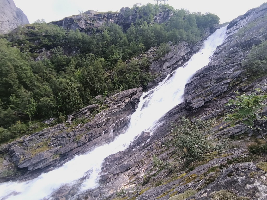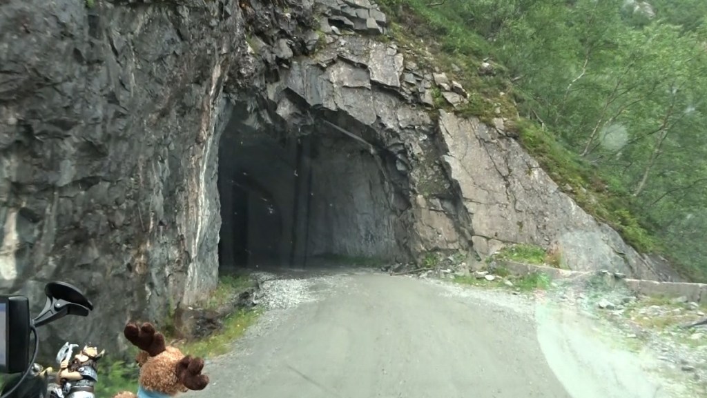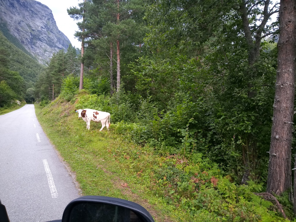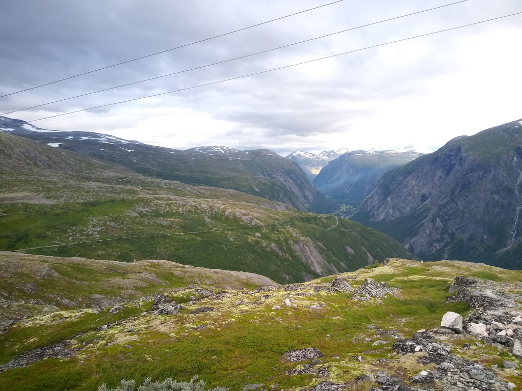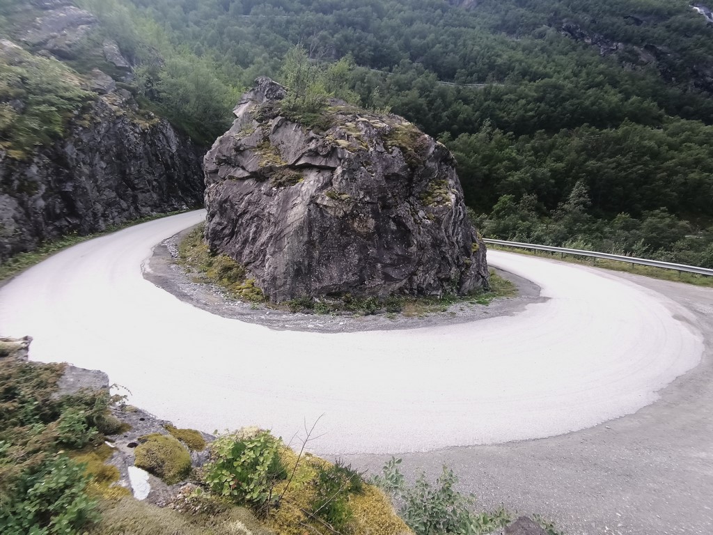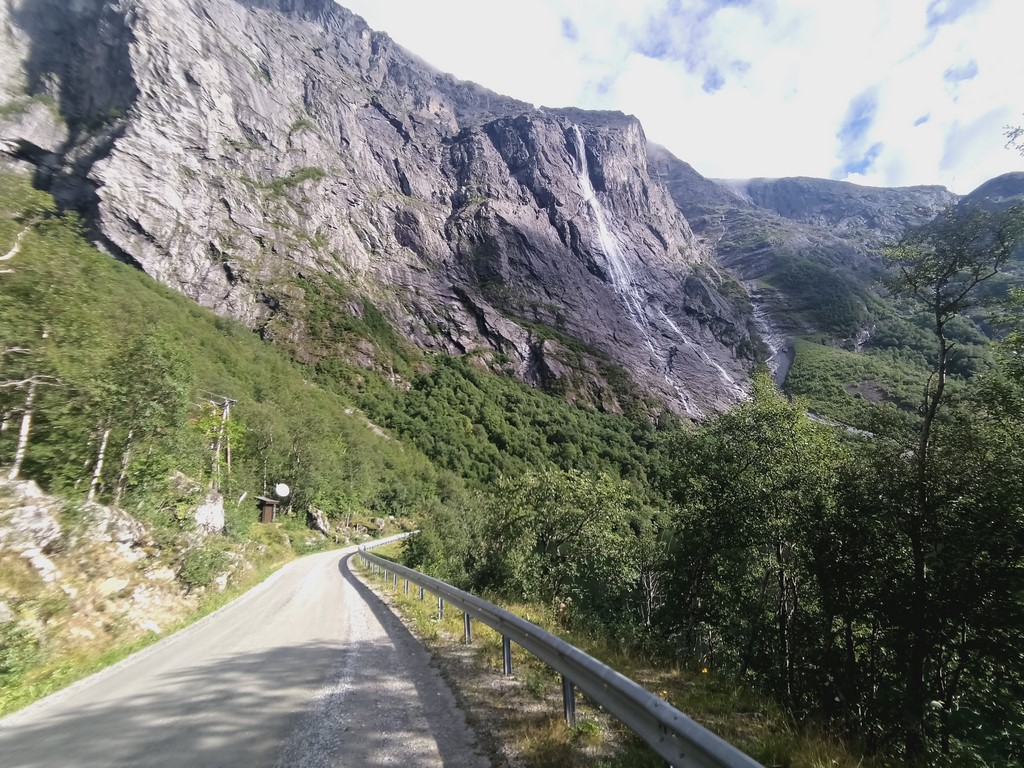 Nous repartons du camping situé en bas de la Trollstigen (pas le dernier qui a de superbes Troll à moto ou à 3 têtes mais qui fait payer la douche 30 NOK, celui d’avant où la douche est dans le prix…), et la suite se situe à nouveau en montagne, avec des virages, des montées et des descentes…