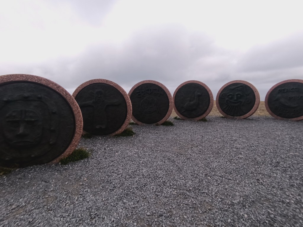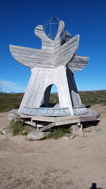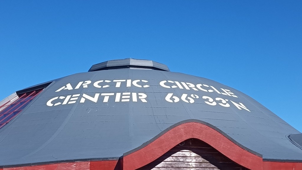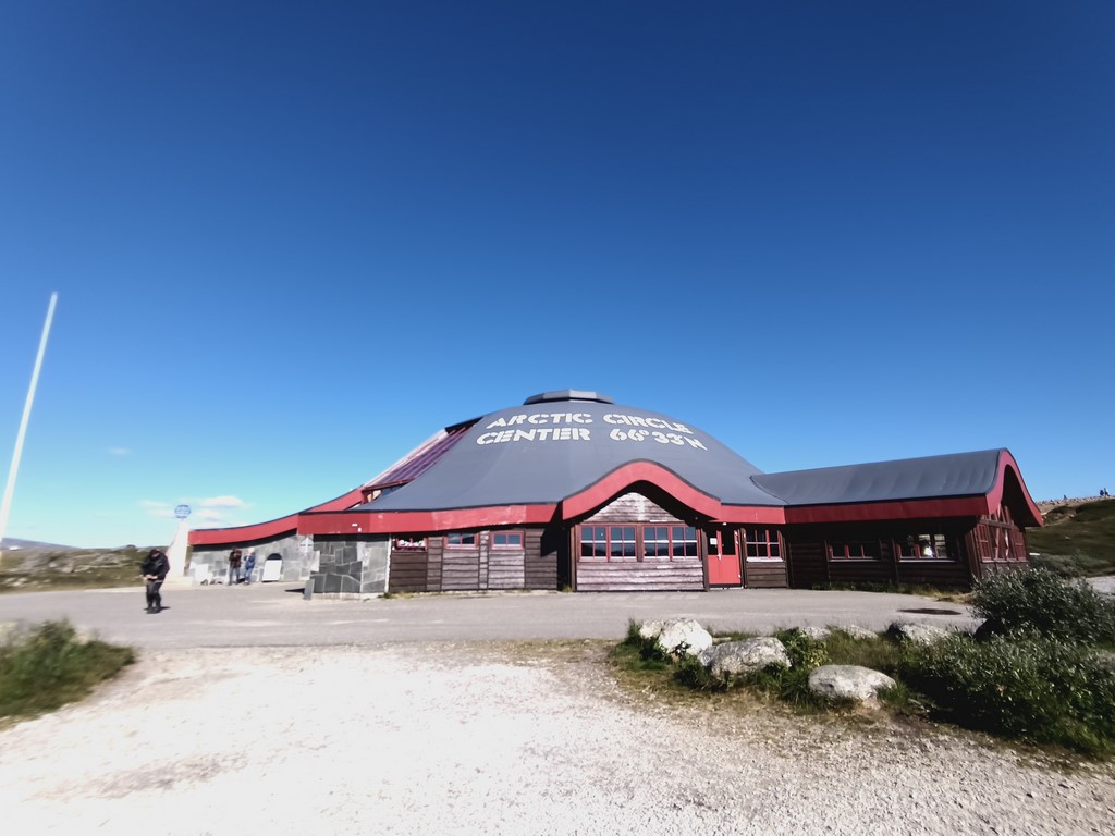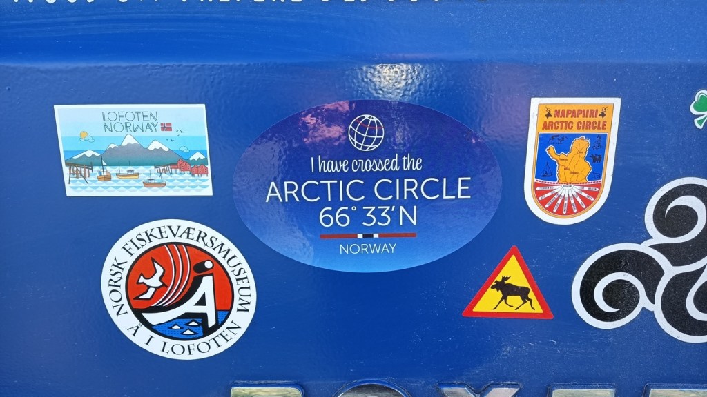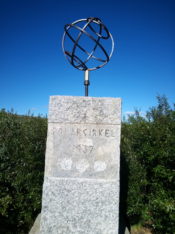 La phase de descente nous amène à un lieu qui nous avait beaucoup plu il y a 9 ans : le centre du cercle polaire. C’est l’endroit matérialisé sur la route où on passe ce fameux cercle dont nous avions parlé à la montée en Finlande. Le lieu comporte divers « totems » qui nous permettent d’immortaliser le moment, un magasin de souvenirs pour trouver quelques babioles et autocollants, et des montagnes tout autours.