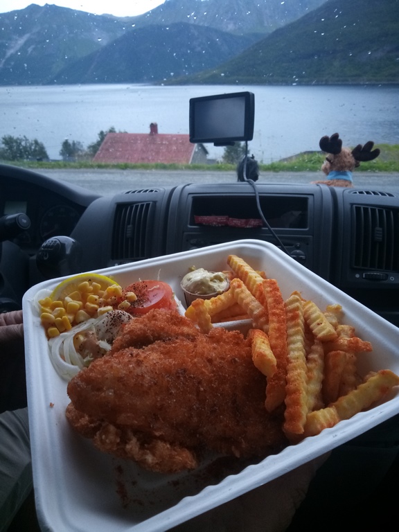 Nous reprenons la route après ce fâcheux incident, jolie route et tunnels, beaucoup de tunnels de plus en plus petits. Au virage qui mène à Fjordard Stef aperçoit un panneau qui indique « fish and chips », mon pécher mignon. Je suis persuadé qu’il m’a fait une blague et là surprise un petit resto nous attend près du port. Il est 16h pas grave faut bien se réconforter de la perte du drone. Petit fish and chips à partager en take away. Parfait, le sourire revient. Un des meilleurs que j’ai eu l’occasion de déguster .