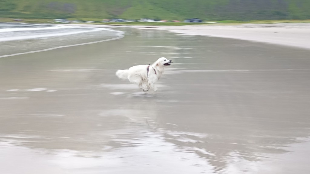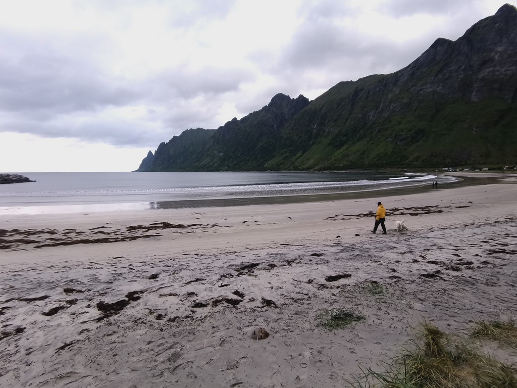 Nous reprenons la route en passant par Steinfjord à cause du tunnel en travaux et découvrons une magnifique plage de sable blanc à Sersford standa. Nickel pour dégourdir les pattes de loulous. Preik se lâche ça fait 15 jours qu’il est en longe. Après une grande cavalcade, nous décidons de nous poser face à la plage avec ses sanitaires tip top, sol chauffé et plafond en verre certainement pour observer les aurores boréales, incroyable. La nuit sera venteuse et pluvieuse.