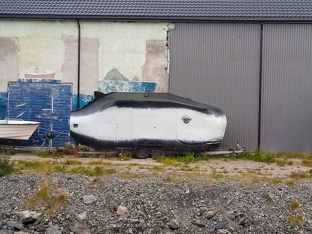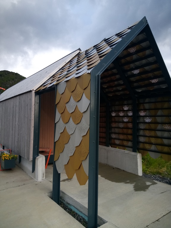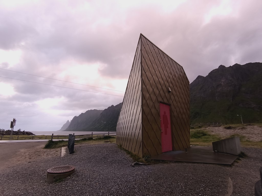 Lever aux aurores en direction de Mefjorvaer, charmant village où nous trouvons une géocache qui se trouve au niveau des sanitaires encore très chouettes, à croire qu’en Norvège ils ont des architectes spécialistes des toilettes.