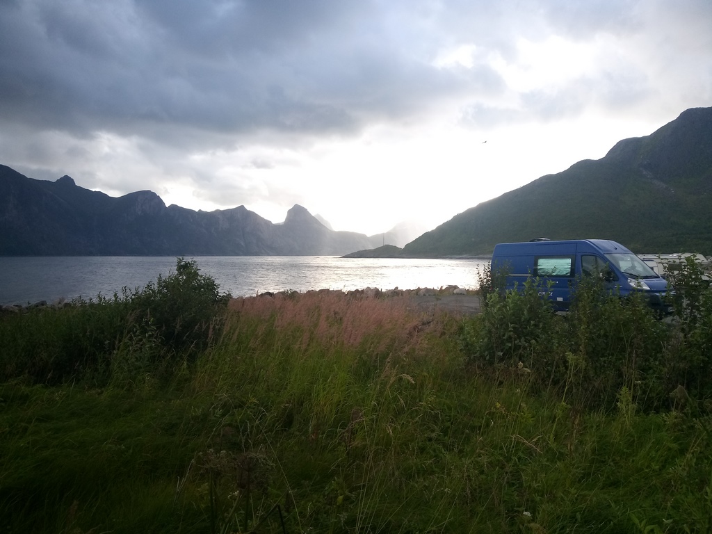 Nous continuons cette belle route par un temps superbe et découvrons des petites plages, une eau limpide, le tout entouré comme partout dans les Lofoten de montagnes imposantes. Nous voyons plusieurs fourgons installés et j’avoue que nous les envions un peu, mais toutes les places sont prises… Toutes ? Non ! Un emplacement résiste encore et toujours à l’envahisseur, grâce à son chemin peu accueillant. Pas de potion magique pour nous mais des pneus Michelin Agilis CrossClimate, dont nous sommes ravis depuis le début du voyage et par toutes sortes de terrains. Nous n’avons pas pu équiper le fourgon de pneus BF Goodrich comme le 4×4 car il faut une réhausse des amortisseurs pour changer de dimension (si j’ai bien compris, pas eu le temps de trop regarder). Bref, les crampons de nos Agilis nous amènent sur ce petit bout de côte libre, avec sa plage, la vue, le soleil qui ferait presque mentir d’autres amis passés par là peu de temps avant et qui prétendent avoir eu un temps froid et humide. Vu les conditions l’itinéraire du jour s’arrête là, nous nous installons et profitons de la vue, du soleil, de l’eau aussi mais jusqu’aux genoux, elle est quand même froide… Preik lui se baigne sans hésitation et semblle apprécier le moment. C’est aussi l’occasion pour Karine de tester son cadeau d’anniversaire, un fauteuil gonflable qui a trouvé sa place dans la soute et n’en était pas encore sorti. On passe du mode « voyage » au mode « vacances » et ça fait du bien ! On sort même le panneau solai re pliant pour la première fois !