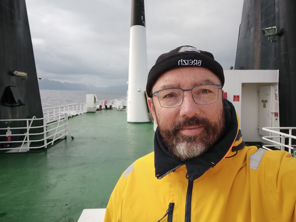 Nous revoilà sur un ferry de Brensholmen à Botnhamn. Preik nous a rejoint exceptionnellement dans la cabine du fourgon et est tout fier de cette nouvelle place que nous lui accordons.