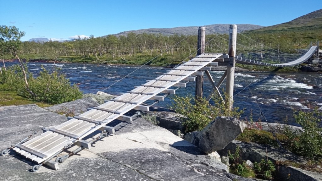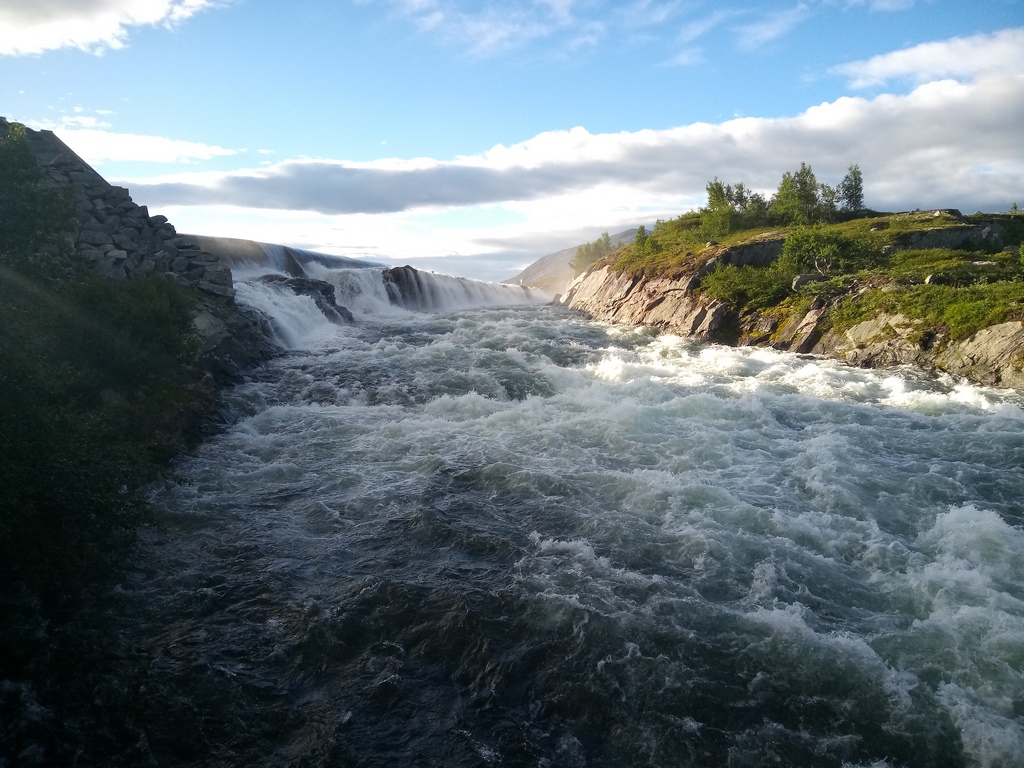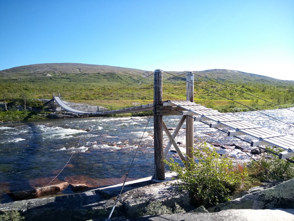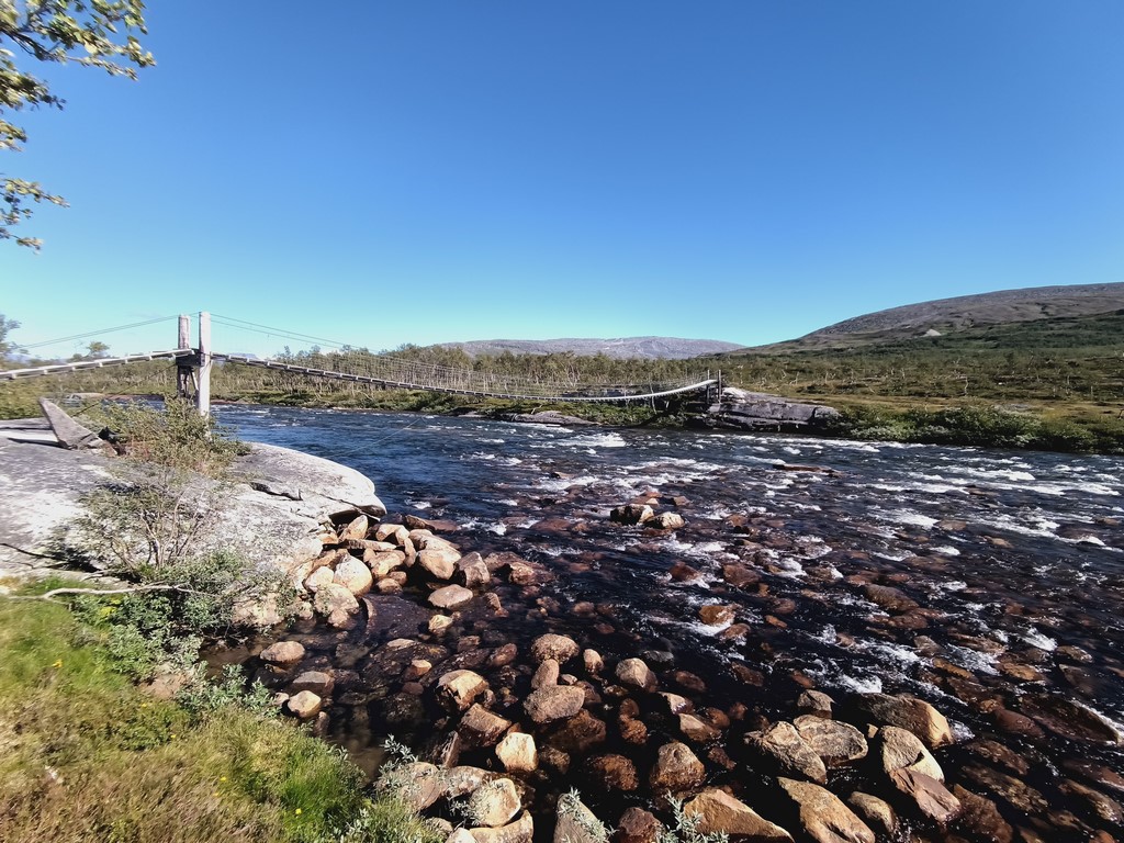La descente se fait donc depuis Narvik par la E6. C’est la route principale mais il ne faut pas imaginer une autoroute pour autant. Il y a des portions à 90, à 60, à 80, à 30, à 50, à 60, bref ça change tout le temps. Des traversées de villages, des montagnes autours, des forêts, les paysages sont très beaux. Nous longeons une grosse rivière, un espèce de torrent qui débite très fort. Des passerelles en bois permettent de passer d’un côté à l’autre pour aller faire sans doute des randonnées dans les hauteurs.