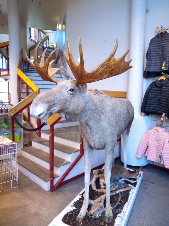 Dernier point notable de cette étape : la grand élan. Il s’agit d’un élan en acier inoxydable poli de plus de 10 mètres de haut. Il domine sur une aire de la route 3, prévenant les automobilistes de la présence de ces grands animaux dans la zone où ils arrivent. Plus beau qu’un panneau, on a beaucoup aimé.