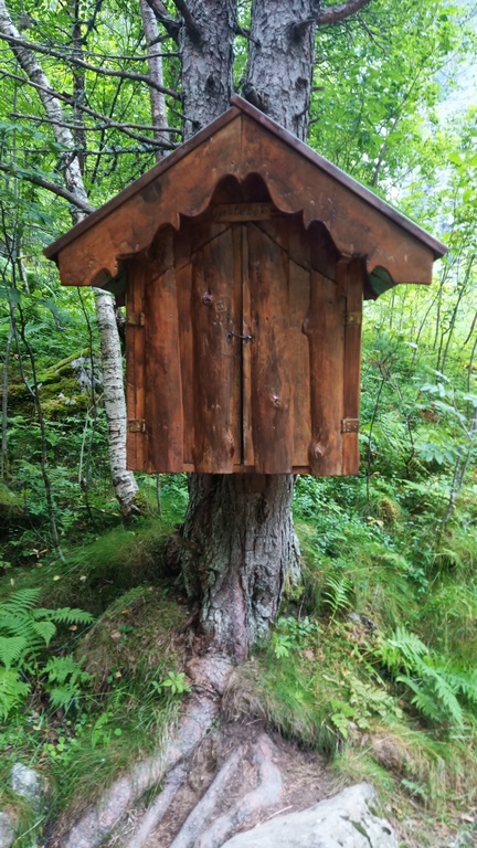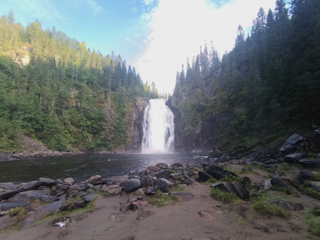 La descente vers Trondheim se poursuit, longue… et le climat semble changer petit à petit, ce qui n’est pas étonnant sur le principe, ça revient à descendre de la latitude de Lille à celle de la Rochelle… Nous nous posons le soir un peu avant Trondheim, dans la montagne, près d’une cascade. Nous y retrouvons un bus de 4 suisses déjà croisés pas loin du Cap Nord. Petite balade dans la forêt pour aller voir la cascade, en guettant s’il n’y a pas d’élan en embuscade vu que nous savons maintenant qu’ils existent et que ce n’est pas un mythe pour touriste ou une opération du lobby des vendeurs de panneaux « attention traversée d’élan ».