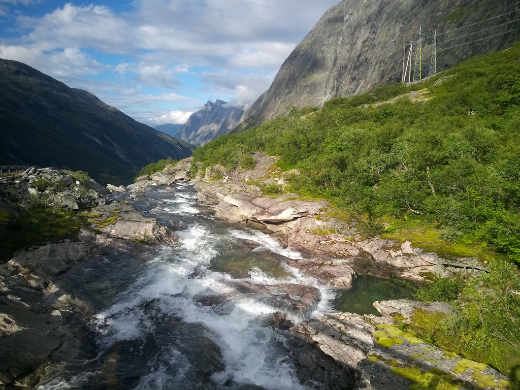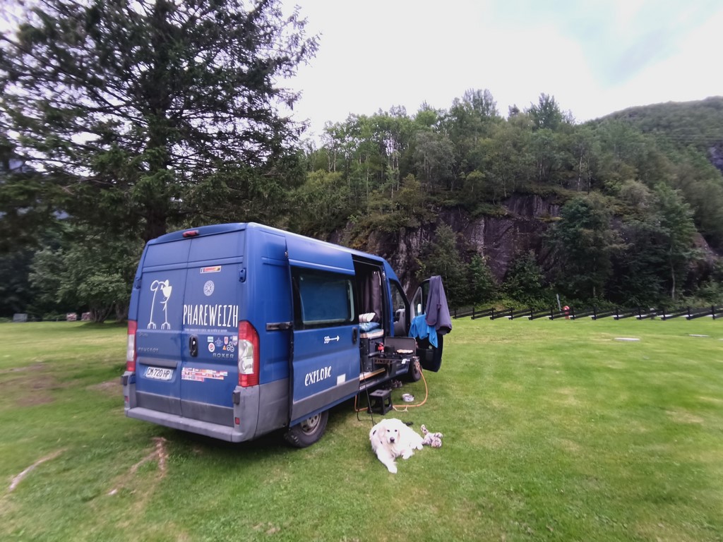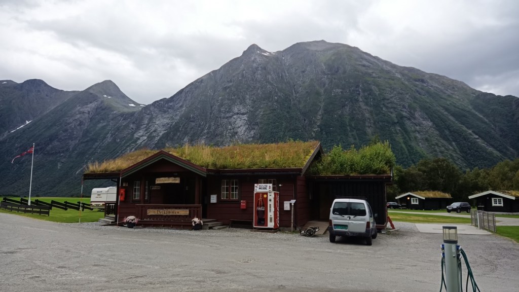 Nous avançons ensuite pour rejoindre Andalsne et nous diriger vers la suite de l’itinéraire. Une petite sieste en bord de fjord puis nous arrivons en bas de la Trollstigen. De la pluie est prévue pour la fin d’après-midi et la nuit, nous préférons rester en bas dans un petit camping charmant, entouré de montagnes (pas le dernier avant la côte, trop de monde…). Pas cher, douche gratuite et à volonté, on profite pour une petite lessive et un peu de repos avant d’attaquer nouveau la montagne et aller vers… on verra où…