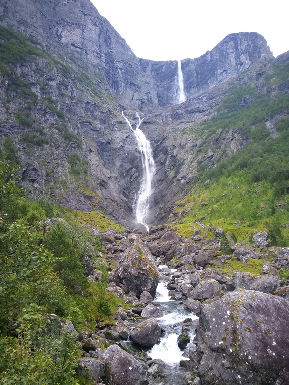La Trollstigen tout d’abord. Oui, elle est vraiment belle ! La particularité du site est la vision globale qu’on peut avoir depuis le bas et depuis le haut sur l’ensemble. C’est impressionnant ! Nous avons attendu le beau temps, c’est parti ! Quelques motos qui attendent en bas, un bus qui monte, du trafic dans les 2 sens, ça se croise… et nous on regarde partout… les virolos, la cascade, le vide… superbe on vous dit !