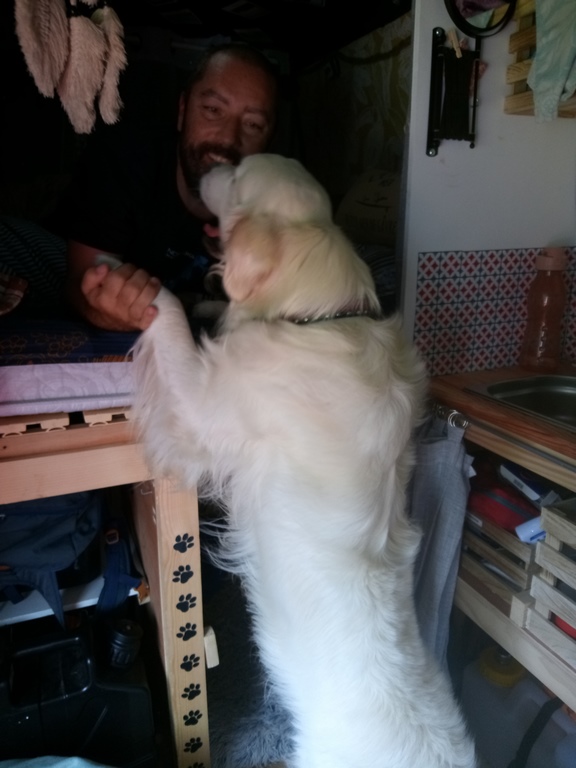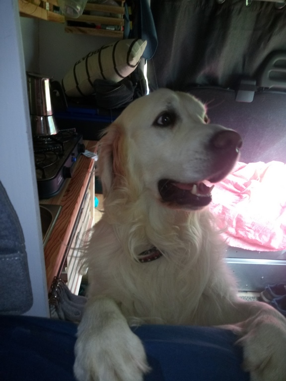 L’écriture se termine dans le fourgon, à côté des serviettes qui sèchent, avec le chien endormi dans sa niche et Karine qui profite de son roman à défaut de pouvoir geeker car nous n’avons pas accès à internet ici.