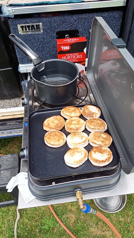 La fraîcheur du nord se fait sentir, la condensation est visible quand on souffle… Au menu pour se réchauffer (même si le froid ressenti en voyageant en fourgon, même sans chauffage, n’a aucun rapport avec celui de nos amis qui font le même trajet avec quelques semaines d’avance, à moto et sous la tente, on connaît bien, bravo !) : nouilles chinoises et compote de pommes. Nous installons ensuite le Kampa Geyser pour la douche chaude au milieu des bois et finissons de tout ranger sous une pluie qui devient soutenue, les choses sérieuses commencent…